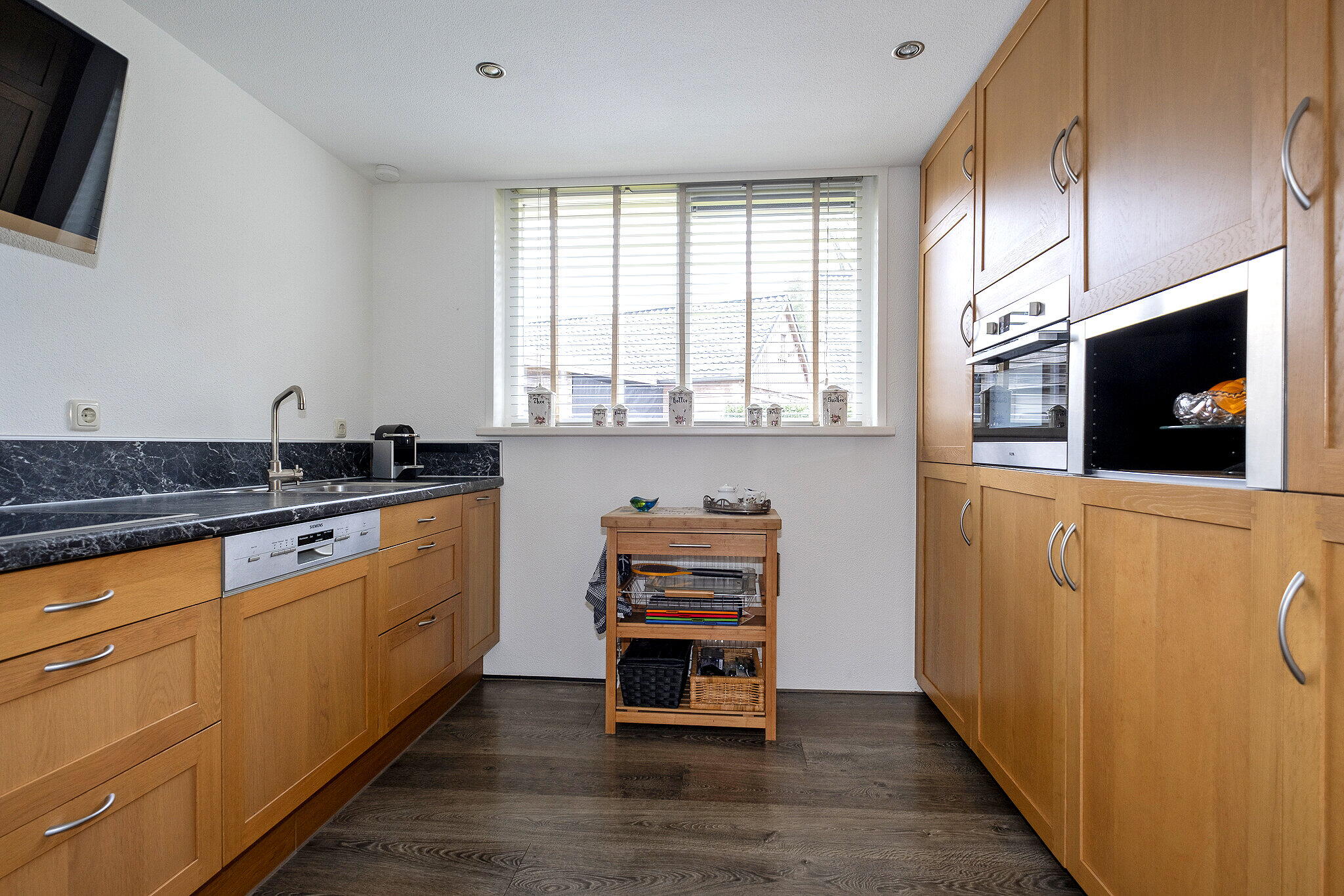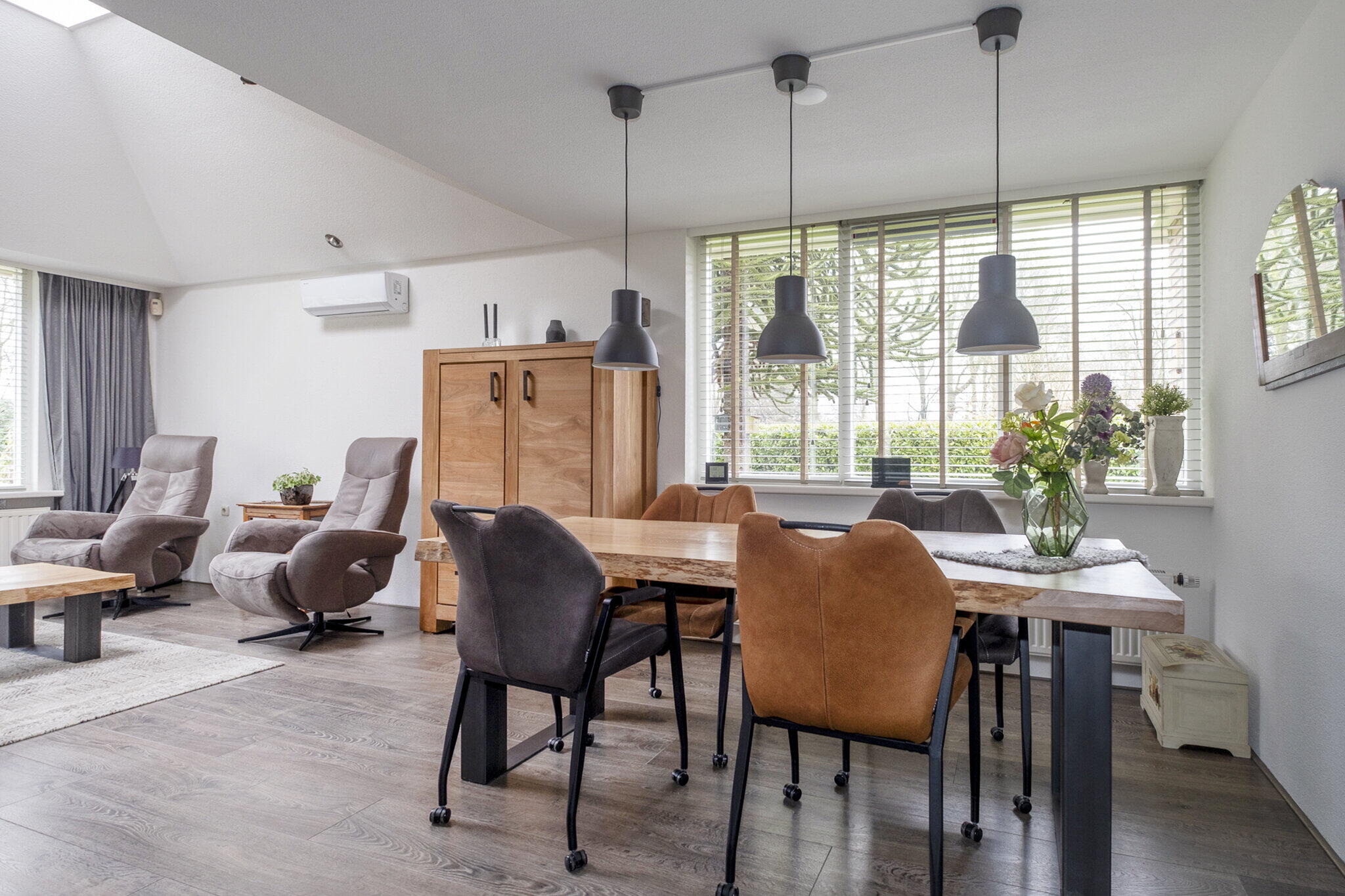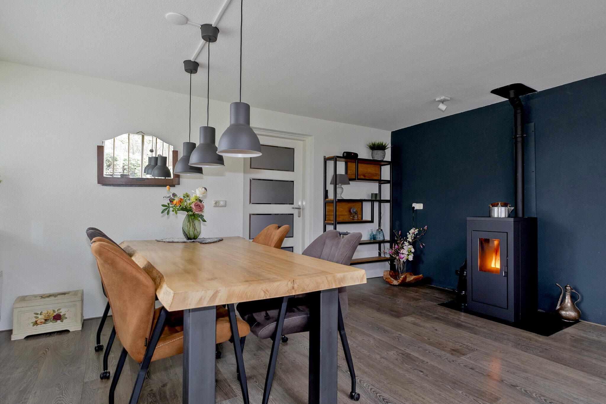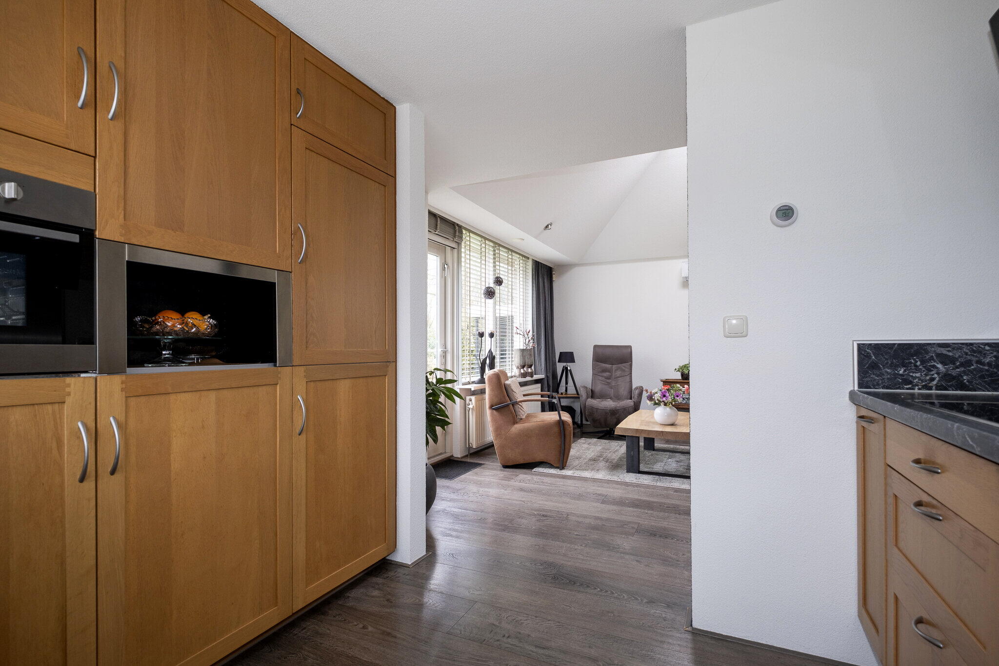 Bij binnenkomst in de hal wordt u verwelkomd door een garderobe. De woonkamer met open keuken heeft een prettige lichtinval en fraaie zichtlijnen naar de tuin. Een stijlvolle laminaatvloer en een sfeervolle pelletkachel maken het geheel compleet. De houten keuken is uitgerust met een koelkast, vriezer, vaatwasser, inductiekookplaat, rvs-afzuigkap en ruime bergruimte. Verder biedt de woning een tweede hal met twee slaapkamers (ca. 14 m² en ca. 8 m²), een toilet en een grote kastenwand. Aan de grote slaapkamer grenst een en-suite badkamer (ca. 6 m²) met toilet, inloopdouche en dubbele wastafel.