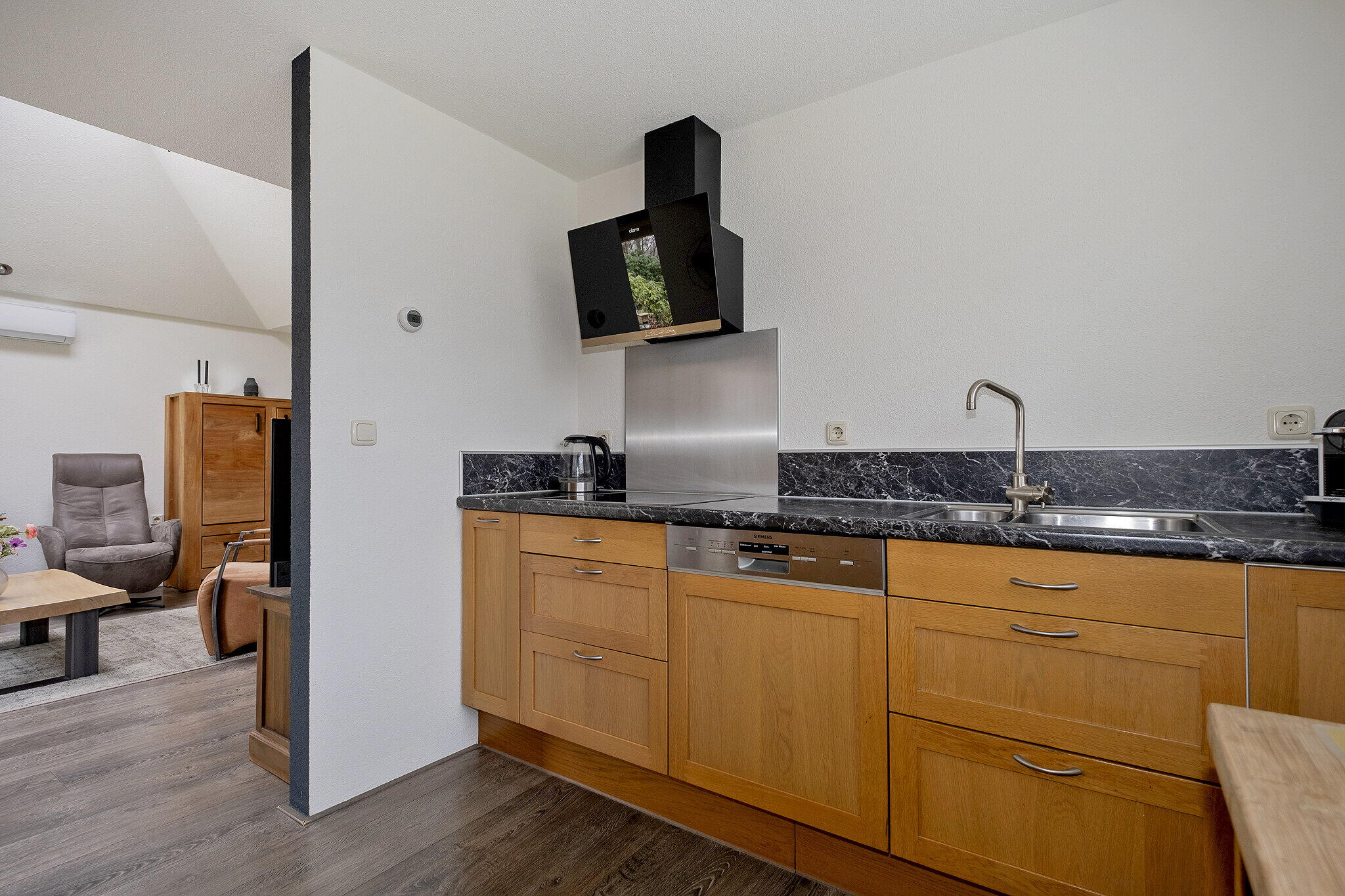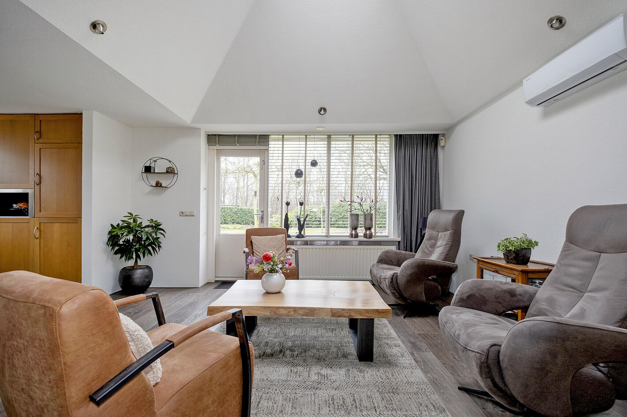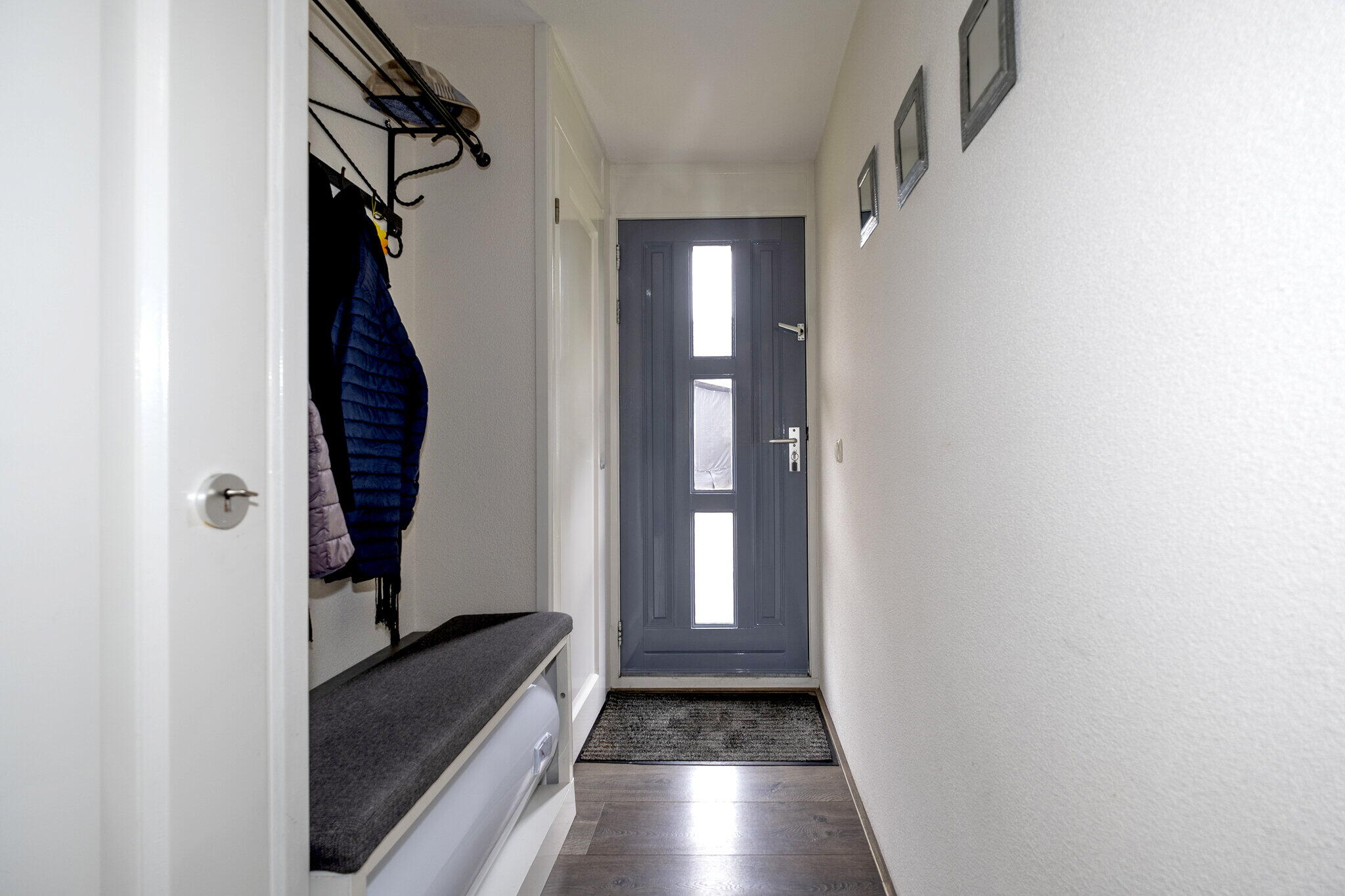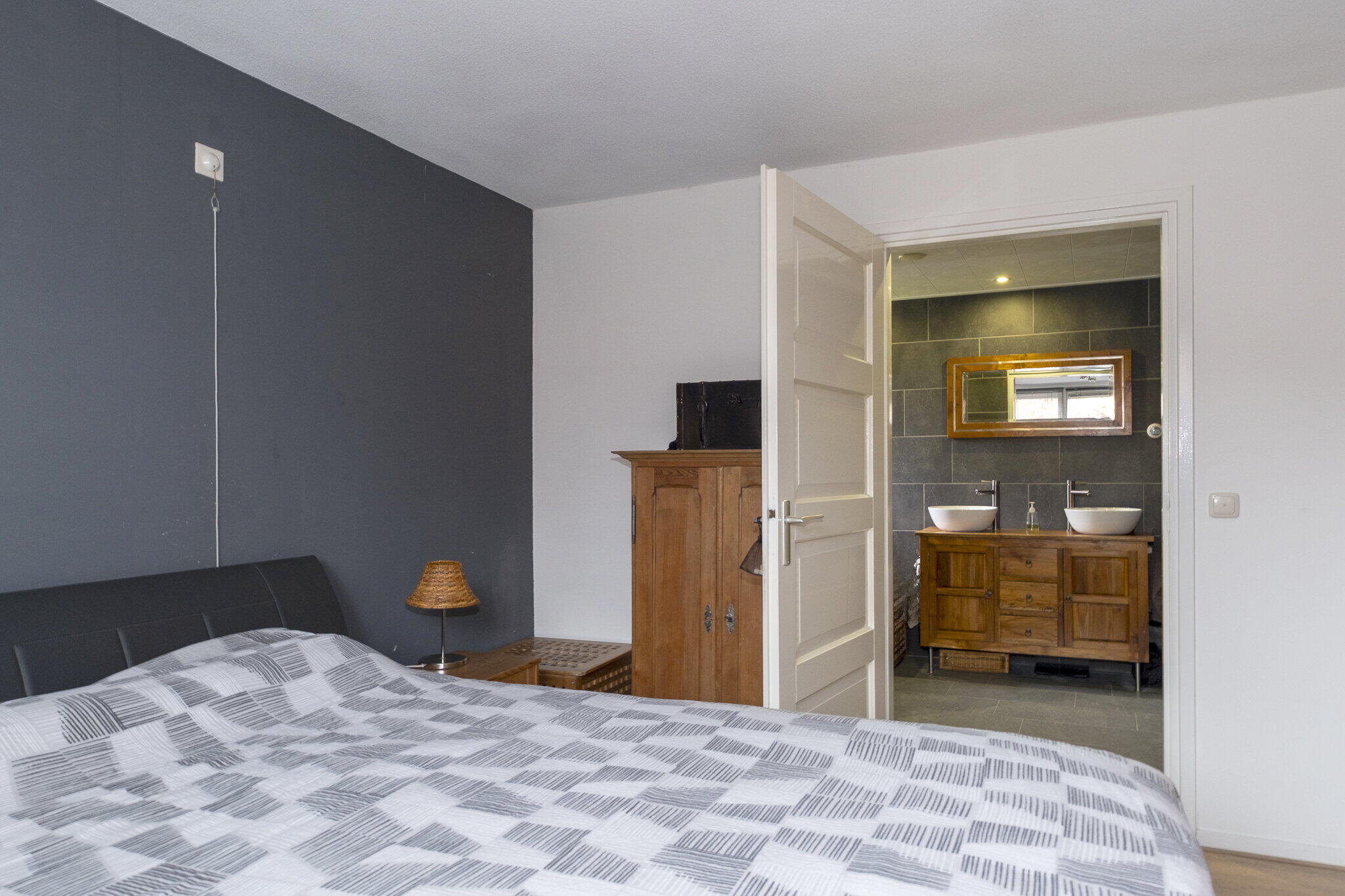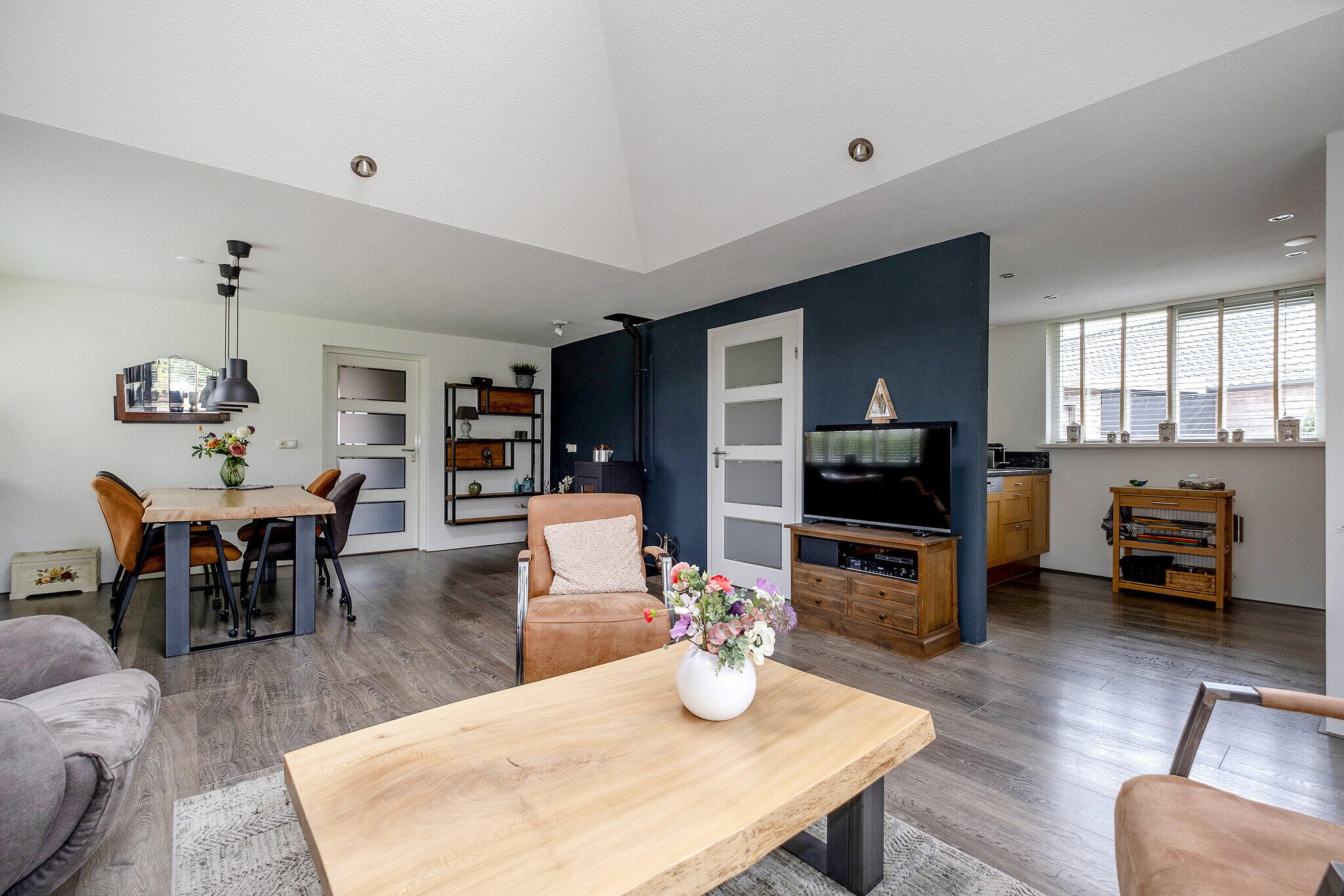 Bij binnenkomst in de hal wordt u verwelkomd door een garderobe. De woonkamer met open keuken heeft een prettige lichtinval en fraaie zichtlijnen naar de tuin. Een stijlvolle laminaatvloer en een sfeervolle pelletkachel maken het geheel compleet. De houten keuken is uitgerust met een koelkast, vriezer, vaatwasser, inductiekookplaat, rvs-afzuigkap en ruime bergruimte. Verder biedt de woning een tweede hal met twee slaapkamers (ca. 14 m² en ca. 8 m²), een toilet en een grote kastenwand. Aan de grote slaapkamer grenst een en-suite badkamer (ca. 6 m²) met toilet, inloopdouche en dubbele wastafel.