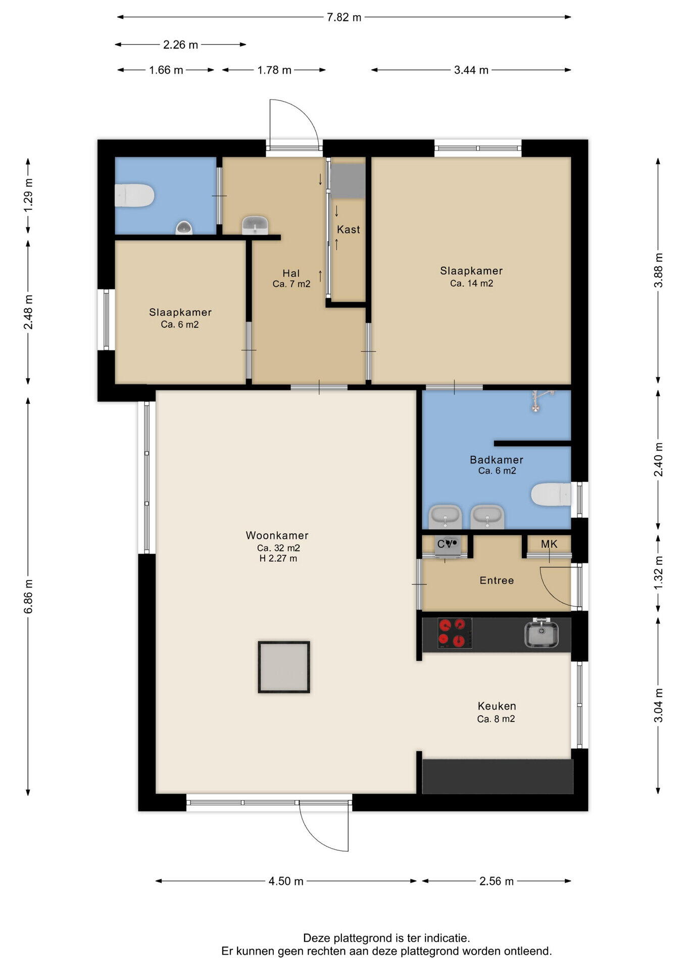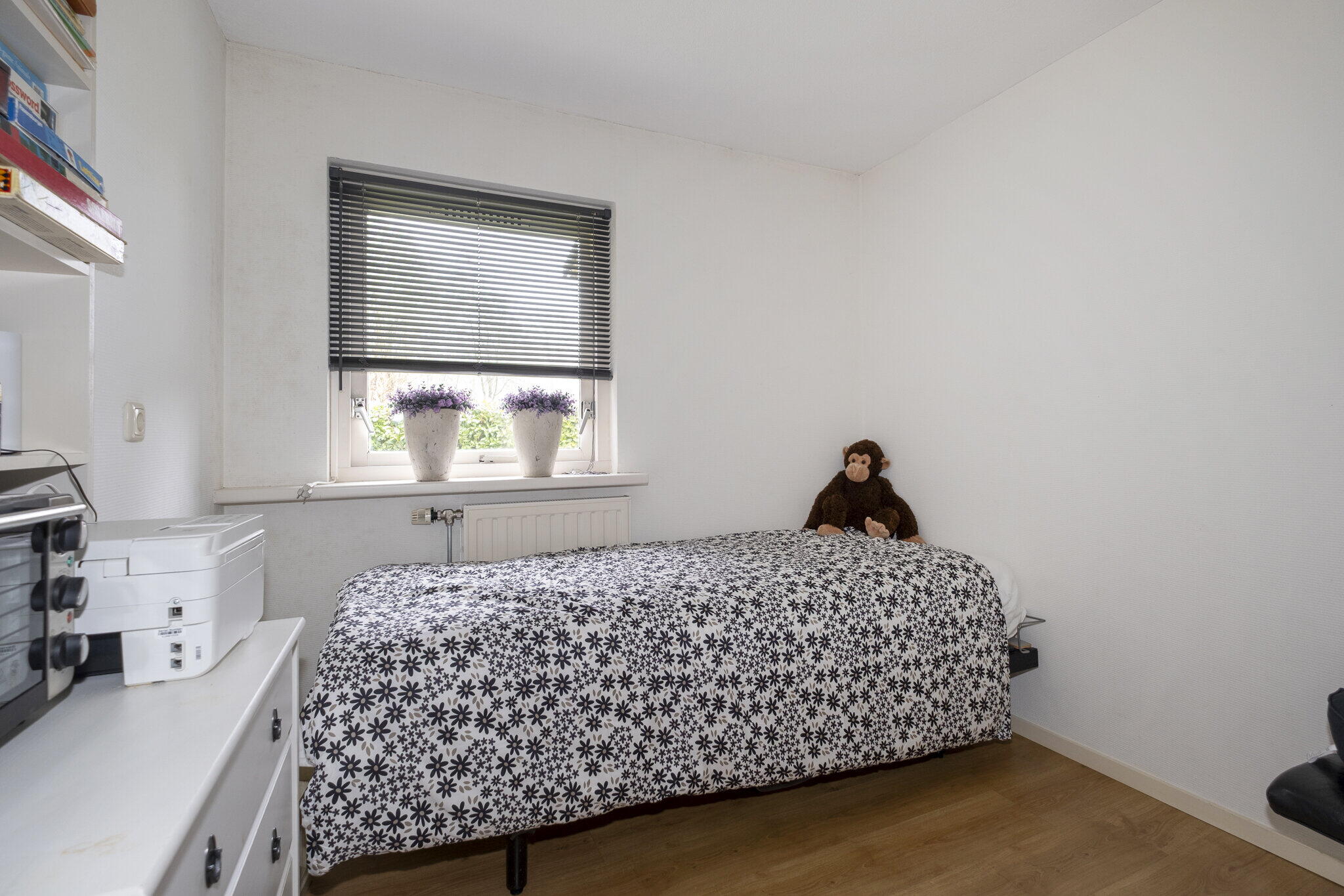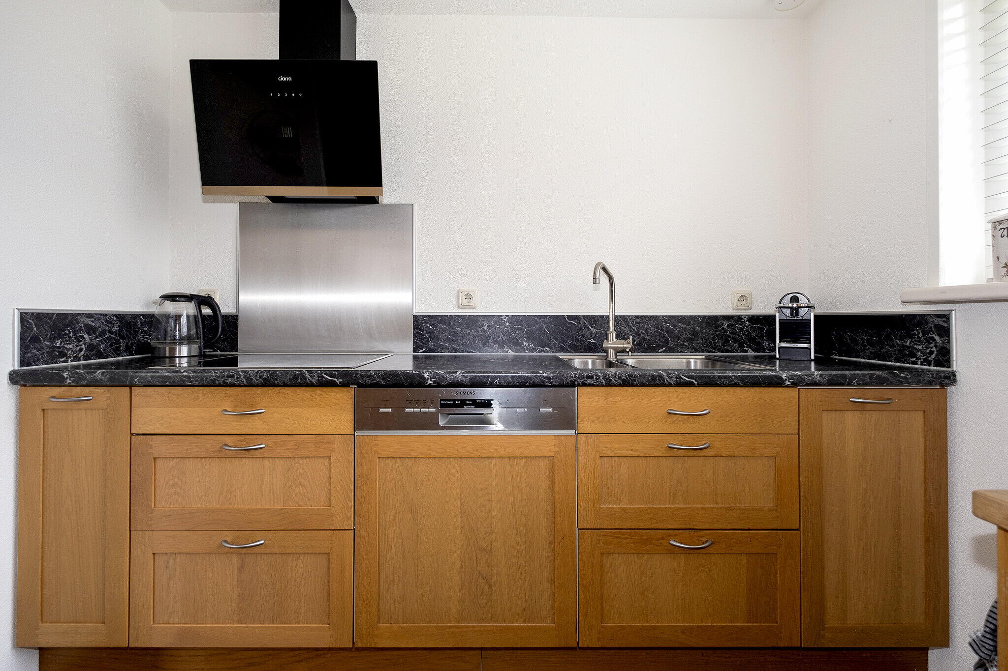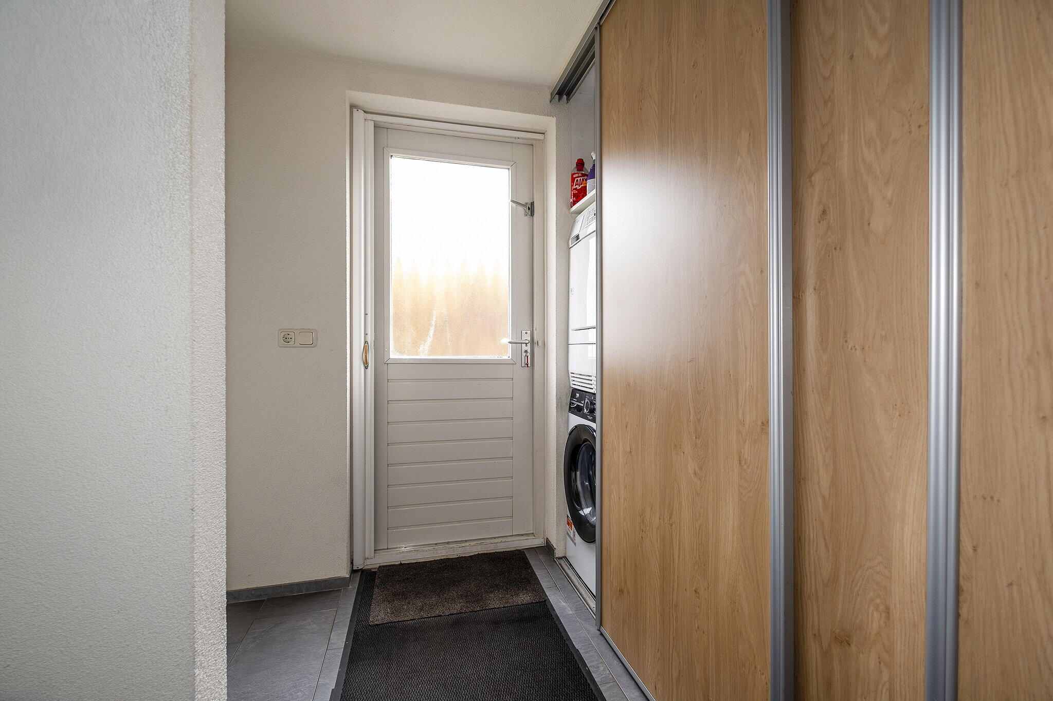 Bij binnenkomst in de hal wordt u verwelkomd door een garderobe. De woonkamer met open keuken heeft een prettige lichtinval en fraaie zichtlijnen naar de tuin. Een stijlvolle laminaatvloer en een sfeervolle pelletkachel maken het geheel compleet. De houten keuken is uitgerust met een koelkast, vriezer, vaatwasser, inductiekookplaat, rvs-afzuigkap en ruime bergruimte. Verder biedt de woning een tweede hal met twee slaapkamers (ca. 14 m² en ca. 8 m²), een toilet en een grote kastenwand. Aan de grote slaapkamer grenst een en-suite badkamer (ca. 6 m²) met toilet, inloopdouche en dubbele wastafel.