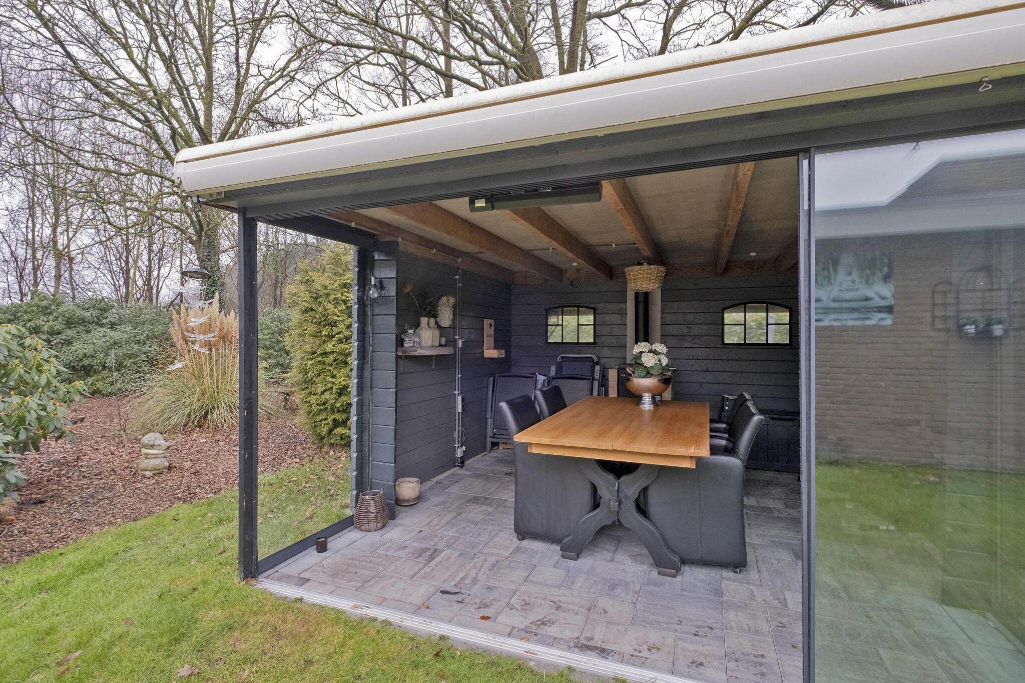 Niet alleen de binnenkant van deze woning is aantrekkelijk; ook het buitenleven is hier heerlijk. Vanuit de woning heeft u direct toegang tot het zonnige terras. Het groen van de tuin omringt het huis volledig en biedt een gevoel van rust en privacy. In de tuin is een stijlvolle tuinkamer gerealiseerd, waar glazen wanden de ruimte kunnen afsluiten.