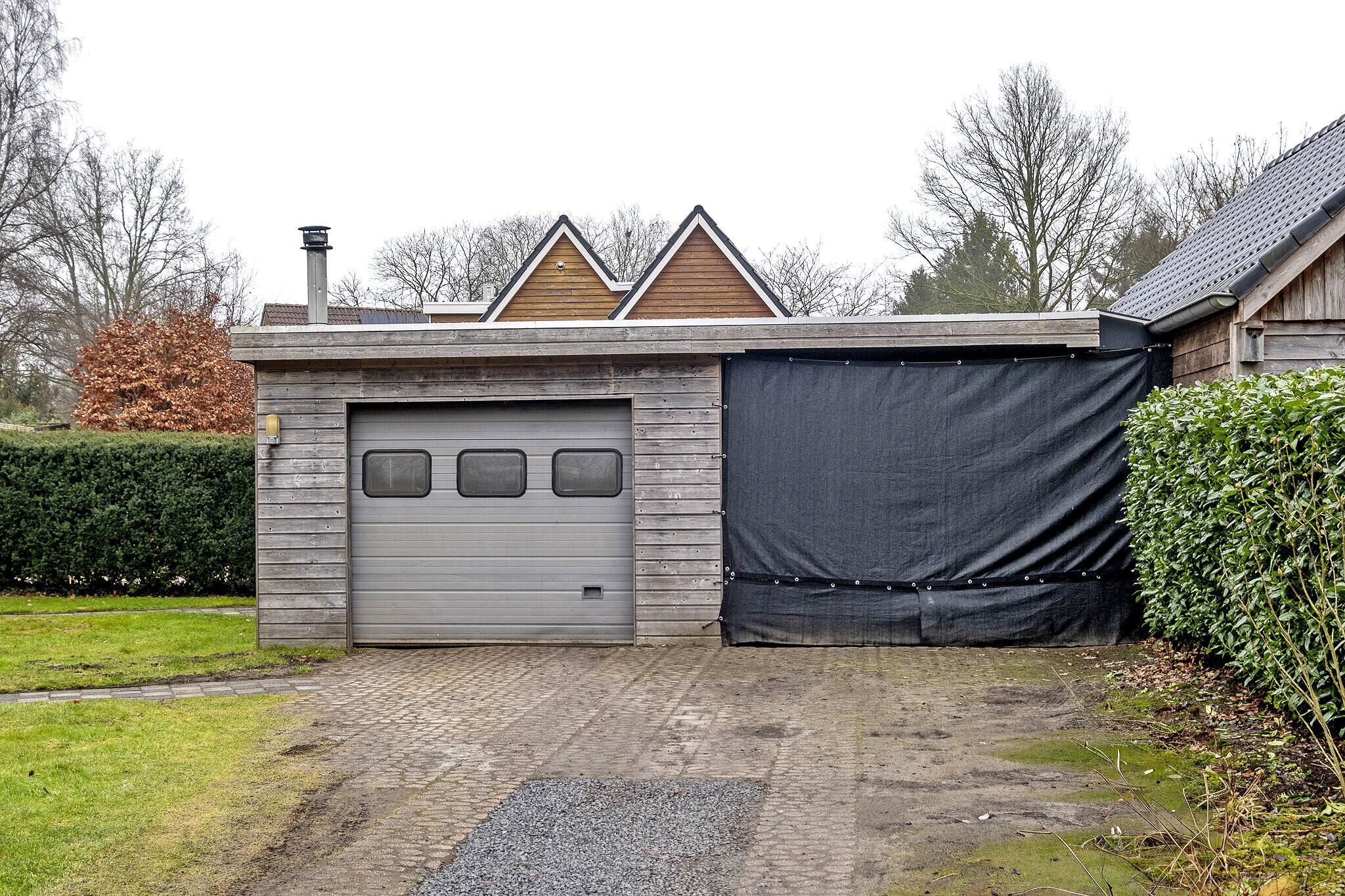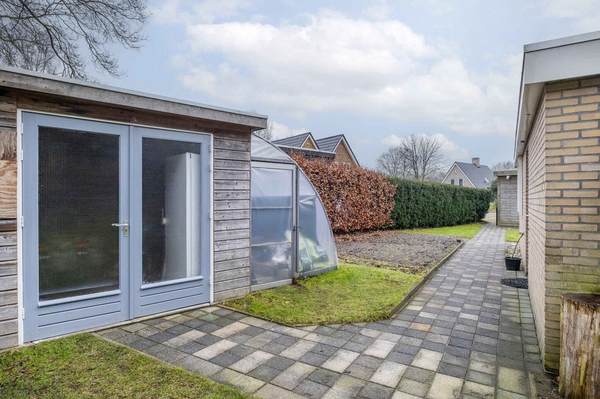 De lange oprit biedt ruimte om meerdere auto’s op eigen terrein te parkeren. Er is een ruime garage met een elektrische overheaddeur. De aangebouwde carport is ideaal voor het stallen van een aanhanger of camper. Achter de woning bevindt zich een fietsenberging met een aangebouwde kas.